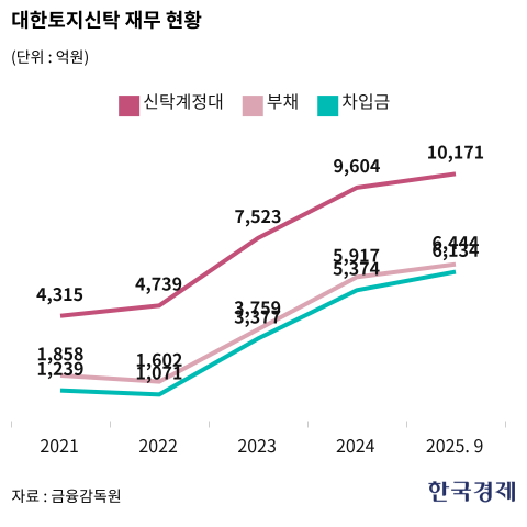 신탁업계 관계자는 "신탁계정대여금이 1조원을 넘어섰다는 것은 현금 회수 속도가 크게 둔화됐다는 의미"라며 "수익성 악화와 차입 증가가 동시에 진행되는 구조는 중장기적으로 부담이 커질 수밖에 없다"고 말했다.