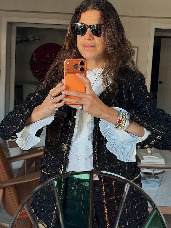 모델 알로마 엘세서처럼 몸에 딱 맞거나 크롭한 실루엣의 트위드 자켓을 선택해 룩의 캐주얼한 매력을 극대화하거나, 로우 라이즈 실루엣의 청바지와 빈티지한 부츠로 자유분방한 인디 슬리즈 감성을 재해석해볼 수도 있습니다.