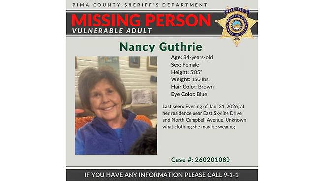 AP통신과 뉴욕타임스(NYT) 등에 따르면 NBC 간판 프로그램 '투데이'의 앵커 서배너 거스리의 모친 낸시 거스리(84)가 지난달 31일 밤(현지시간) 애리조나주 투손의 자택에서 사라진 뒤 행방이 묘연한 상태입니다.