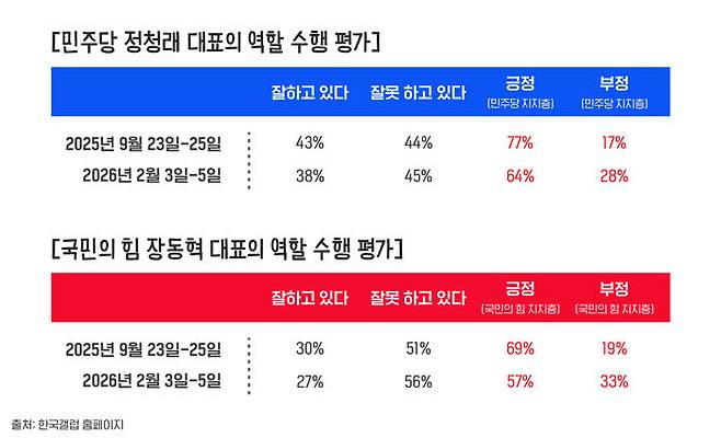 그렇다면, 여당 승리론이 우세해지는 요인들이 있을 텐데요... 이번 여론조사에 담긴 결과 중에 원내 1,2당 대표들의 역할 수행에 대한 평가 결과도 여론의 흐름을 짚는 데 도움이 될 것 같습니다. 질문의 취지는 '정청래/ 장동혁 대표가 당 대표로서 역할을 잘 수행하고 있다고 보느냐, 잘못 수행하고 있다고 보느냐'였습니다.