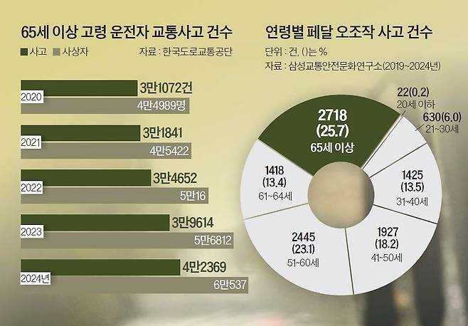 그러는 사이 고령 운전자에 의한 교통사고는 더욱 가파르게 늘고 있다. 국내 교통사고 발생 건수는 2015년 23만2000건을 기록한 뒤 2024년 19만6000건으로 꾸준히 감소하고 있다. 반면 65세 이상 고령 운전자에 의한 교통사고는 2015년 2만3000건에서 2024년 4만2369건으로 10년 새 두 배 가까이 늘었다. 전체 교통사고 다섯 건 중 한 건(21.6%)은 고령 운전자 교통사고인 셈이다.