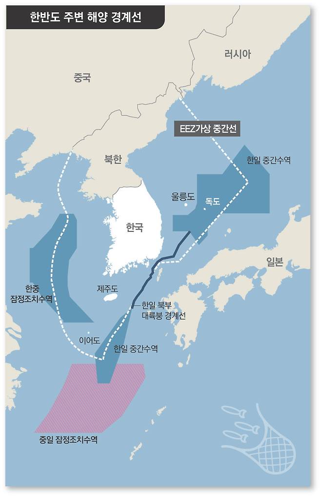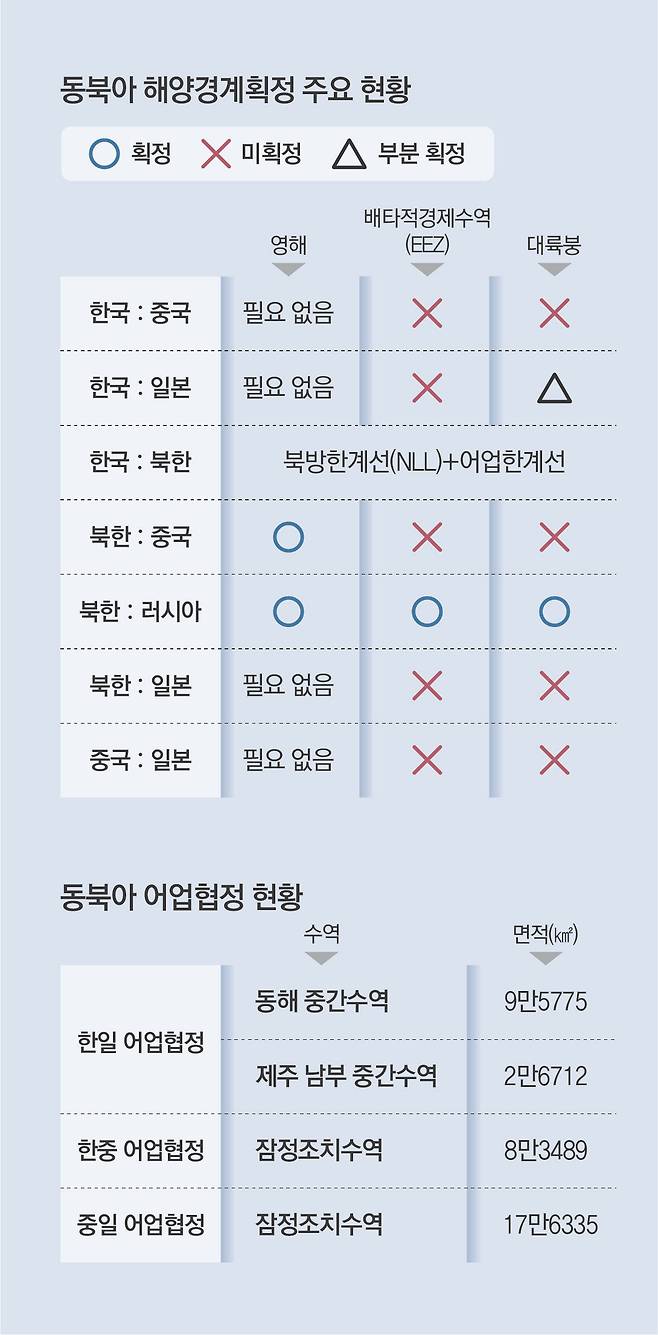 한국과 일본은 1974년에 대한해협 인근 북부 대륙붕 경계선을 합의하고, 동중국해에서는 남부 대륙붕 공동개발구역(JDZ) 협정을 체결했다. 하지만 JDZ 협정은 해양 경계선을 확정한 것이 아니라, 50년간 해당 구역의 자원을 공동 개발하자는 성격의 협정이다. 한국과 일본은 1996년부터 2010년까지 해양 경계 획정을 위한 회담을 11차에 걸쳐 진행했지만 독도를 둘러싼 일본의 억지 주장으로 회담은 2011년 이후 중단된 상태다.