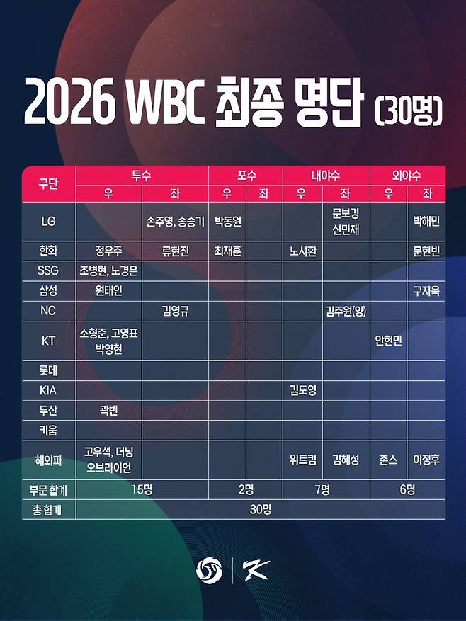 이번 명단에는 투수 15명, 야수 15명이 선발된 가운데 KBO리그 소속 선수 23명, 메이저리그(MLB) 소속 7명이 이름을 올렸다.
