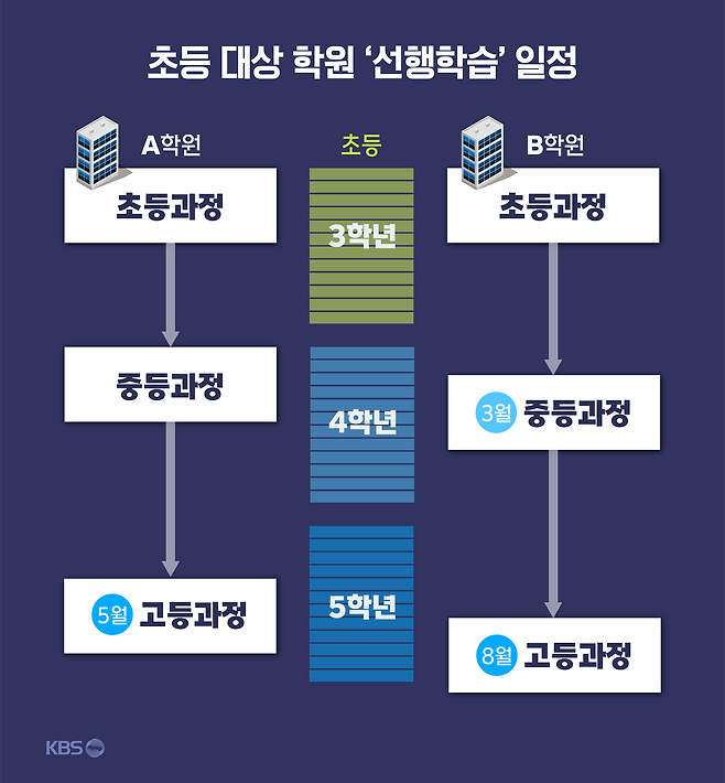 이 학원만 선행을 강조하는 것이 아닙니다. 전국 170여 개 지점을 둔 초등 대상 또 다른 수학 학원 역시 최근 학부모 설명회에서 '성공적인 입시를 위한 로드맵'을 제시하며 4학년 봄에 중학교 과정을 시작하고, 5학년 여름에는 '공통수학'을 들어가야 한다고 강조했습니다.