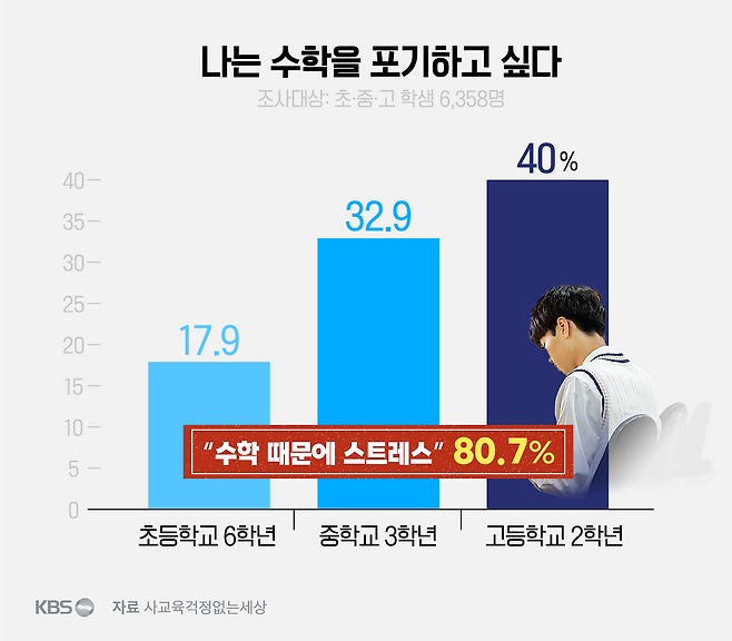 사걱세가 지난달 발표한 학생 6,300여 명을 대상으로 진행한 수학 교육 관련 설문조사 결과를 보면, 중학교 3학년 학생의 32.9%, 고등학교 2학년의 40%는 "나는 수학을 포기하고 싶다"라고 답했습니다.