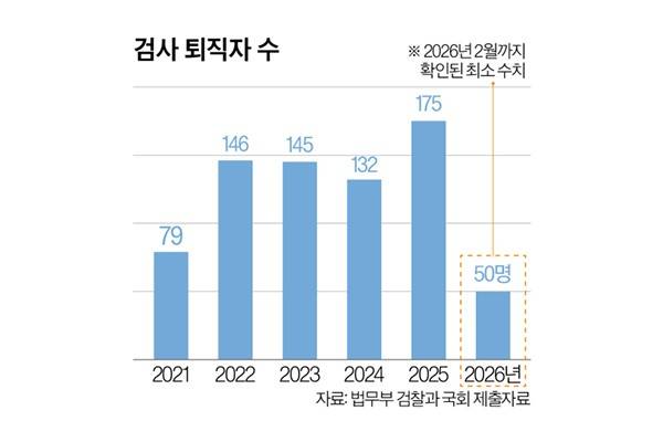 2025년에는 175명의 검사가 검찰을 떠났다. 올해까지 2년이 채 안 되는 기간 220명이 넘는 인원이 사직한 셈이다. 2025년 기준 검사 수가 2124명이었던 점을 고려하면 전체 10%가 넘는 인원이 검찰을 떠난 것. 서울중앙지검 검사 수가 200여 명인 걸 감안하면, 서울중앙지검이 통째로 없어진 것과 같고, 웬만한 지방검찰청 두세 개가 사라진 규모이기도 하다.