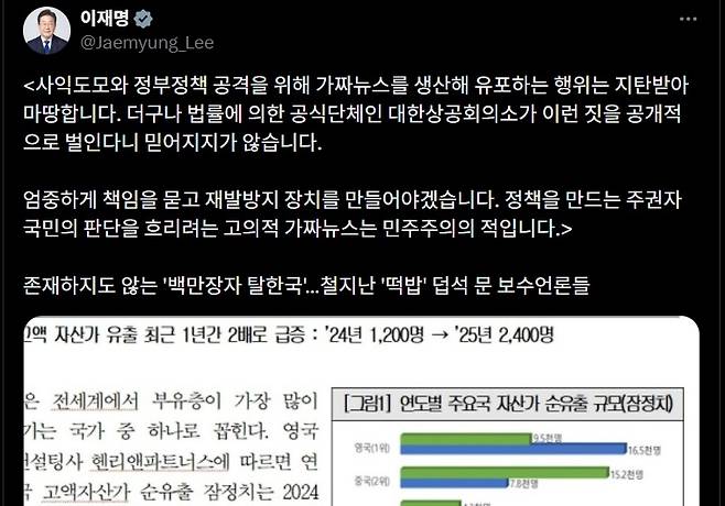 | ▲ 대한상공회의소의 공신력 없는 통계 인용과 이를 토대로 한 '백만장자 탈한국' 오보를 두고 이재명 대통령이 7일 오전 X(옛 트위터)에 "엄중하게 책임을 묻고 재발 방지 장치를 만들어야겠다"고 밝혔다. |