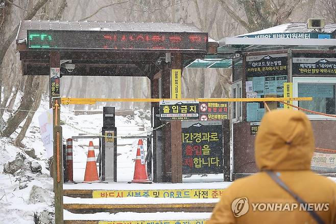 (제주=연합뉴스) 백나용 기자 = 제주 산지에 대설특보가 내려진 7일 오전 한라산국립공원 성판악 탐방안내소 전광판이 탐방 전면 통제를 알리고 있다. 2026.2.7