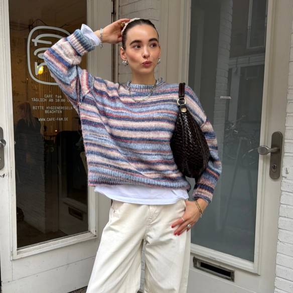 물론 화이트 바지도 가능합니다! 특히 와이드 핏 데님이라면 멀티 컬러 스트라이프 니트와 함께 입어 보세요. 오버사이즈 핏으로 살짝 늘어지게 연출하고 소매도 접어 입으면 한결 편안해 보입니다. 이런 경우엔 볼드한 이어링과 심플한 네크리스 한 두개를 레이어링 해주면 좋아요. 화려한 스트라이프를 헤치지 않을 정도로 말이죠.