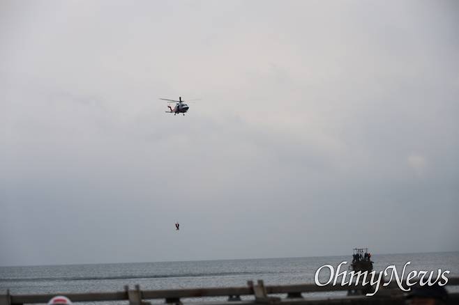 | ▲ 장생탄광 84주기 추모식이 열린 7일 오후 피아를 통해 들어간 대만인 잠수사가 의식을 잃자 헬기가 동원돼 끌어올리고 있다. |