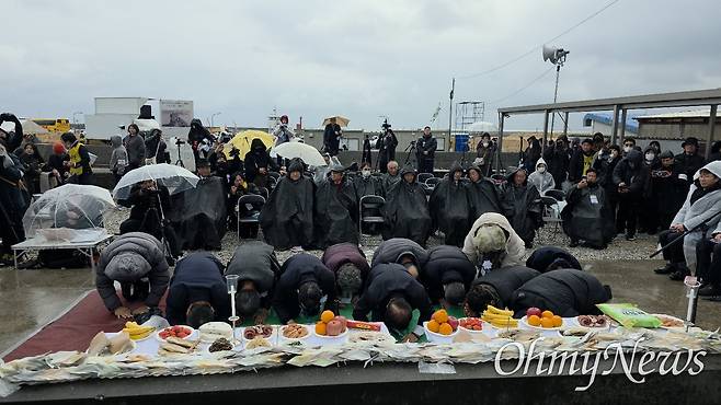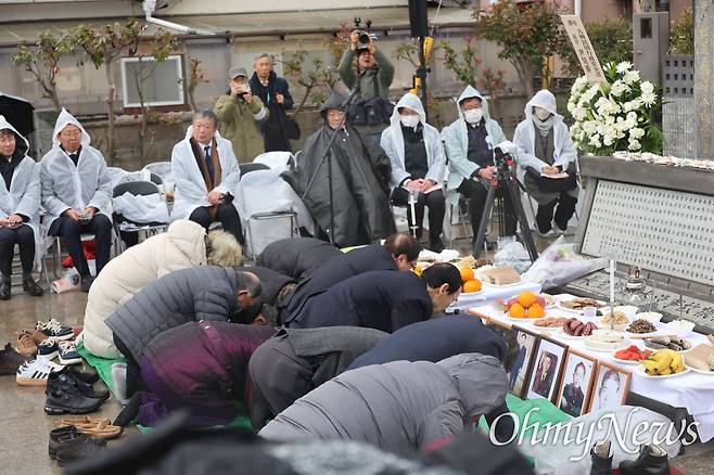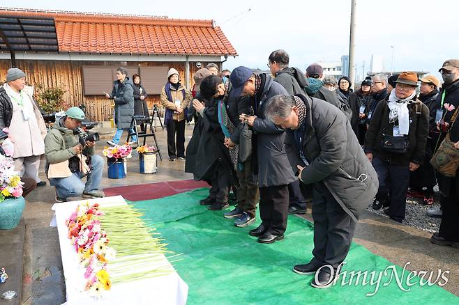 | ▲ 장생탄광 84주기 추모식이 열린 7일 오전 일본 야마구치현 우베시 장생탄광 희생자 추모공원에서 한국 유족들이 절을 올리고 있다. |