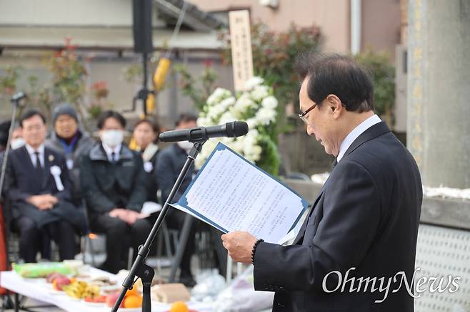 | ▲ 양현 장생탄광희생자 한국유족회 회장이 7일 오전 일본 야마구치현 우베시 장생탄광 희생자 추모탑 앞에서 열린 추모식에서 추모사를 하고 있다. |