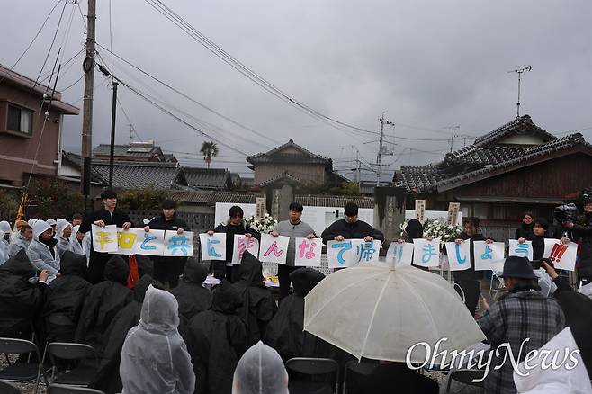 | ▲ 장생탄광 84주기 추모식이 열린 7일 한일 양국 청소년들이 평화를 위한 내용을 담은 손피켓을 들어보이고 있다. |