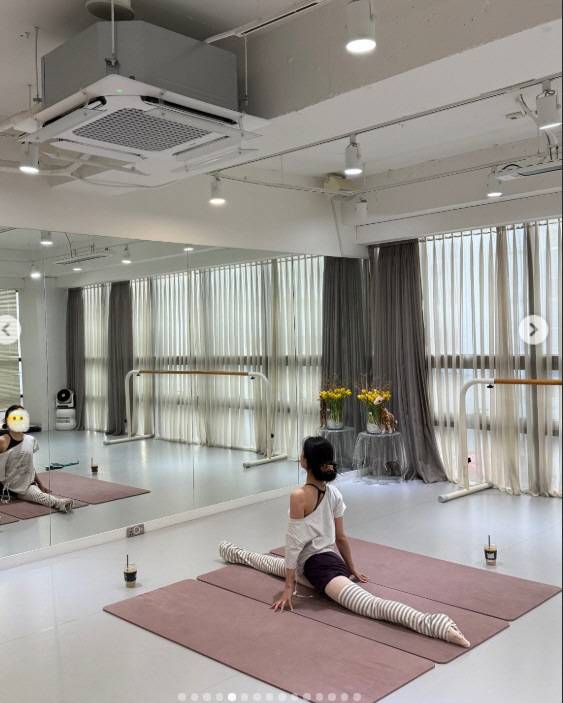 사진 속 수지는 발레 바가 설치된 연습실에서 매트 위에 앉아 180도 다리 찢기 포즈를 선보이고 있다.