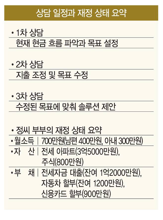 부부의 재정 상황이 어떤지 살펴보자. 둘 다 벤처기업을 다니는 부부의 월소득은 700만원이다. 남편이 400만원, 아내가 300만원을 번다. 두 사람이 1년에 상여금을 600만원가량 받지만, 정기소득이 아니므로 제외했다.