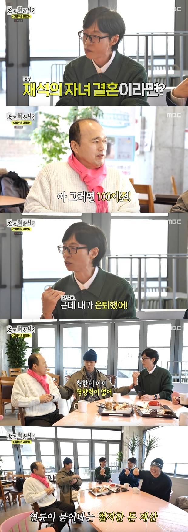부담스럽다는 발언에 하하는 “재석이 형 애기가 결혼해”라고 물었고, 이에 김광규는 일말의 주저도 없이 “그러면 100”이라고 답하면서 웃음을 자아냈다.