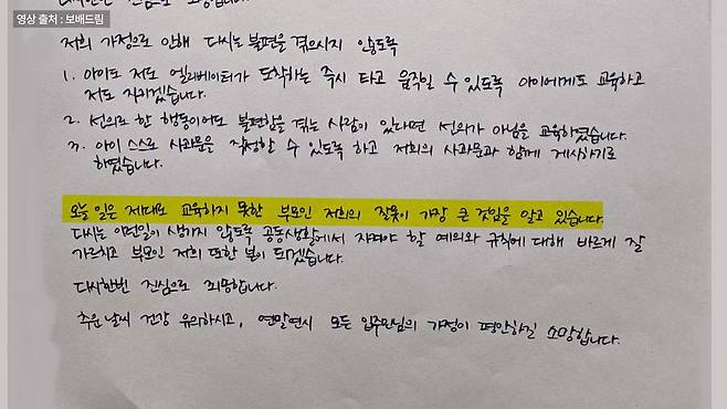 나머지 한 장은 엄마 은지씨의 사과문이었는데 여기엔 당시 상황에 대한 자세한 설명과 “오늘 일은 제대로 교육하지 못한 부모의 잘못”이라는 반성과, 그리고 재발 방지를 위해 제대로 교육시키겠다는 다짐까지 담겼습니다.