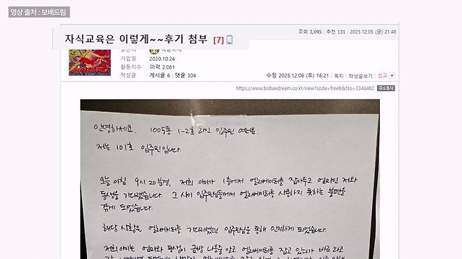 또 다른 입주민은 온라인 커뮤티니에 “자식 교육은 이렇게...”라는 제목으로 사진을 공개하며 자랑했고, 언론에도 보도돼 화제가 되기도 했습니다. 이레는 자신의 잘못을 이웃들이 다 알게 돼 부끄럽지만 한편으로는 뿌듯했다고 합니다.
