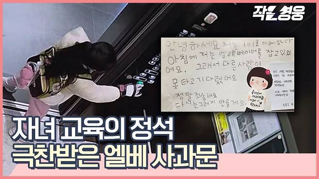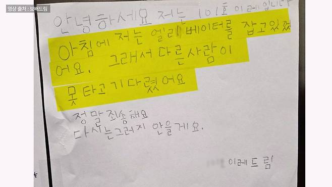 한 장의 종이엔 삐뚤빼둘한 글씨로 “아침에 저는 엘리베이터를 잡고 있었어요. 그래서 다른 사람이 못 타고 기다렸어요. 정말 죄송해요. 다시는 그러지 않을게요” 라고 쓰여져 있습니다. 7살 이레의 사과문입니다.