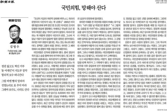 조선일보에 ‘국민의힘, 망해야 산다’는 제목의 칼럼까지 등장했습니다. “정권 잃고도 혁신 거부, ‘윤 어게인’이 지도부 장악, 합리적 보수 떠나간다.” “그럴 바엔 빨리 망하자, 진영 논리로 표 주지 마라, 그래야 보수도 나라도 산다”는 부제가 달렸습니다.