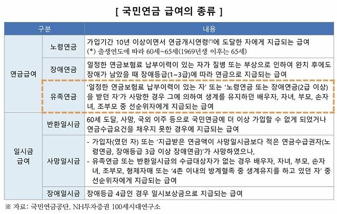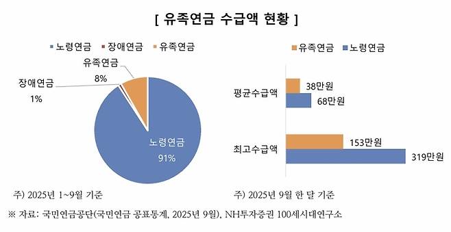 NH투자증권 100세시대연구소에 따르면 유족연금 수급자의 약 67%는 월 20만원 이상 40만원 미만을 받고 있는 것으로 나타났습니다.