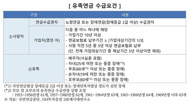 유족연금을 받으려면 사망자와 유족 요건을 모두 충족해야 합니다. 사망자는 노령연금이나 장애연금(1~2급) 수급자이거나, 가입기간 10년 이상 등 일정한 보험료 납부이력이 있어야 합니다.