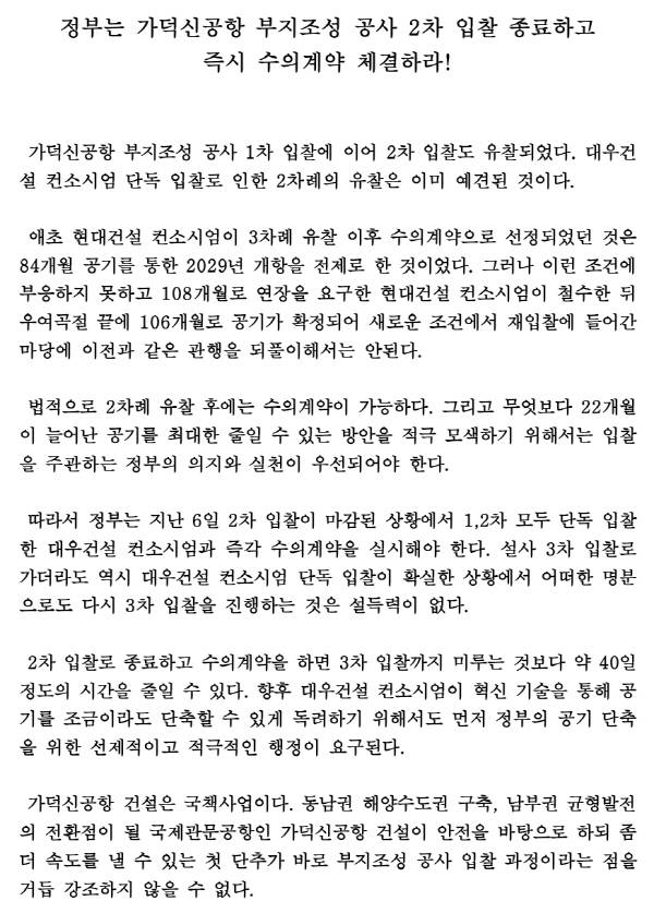 이와 관련, '신공항과 거점항공사 추진 부산시민운동본부'는 8일 성명을 통해 현재 상황을 고려하면 3차 입찰을 진행하는 것은 설득력이 없다며 즉시 수의계약을 해야 한다고 촉구했다.