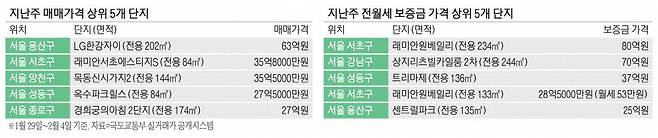 지난주(1월 29일~2월 4일) 전국 아파트 매매 거래 가운데 최고가를 기록한 곳은 서울 용산구 'LG한강자이' 전용면적 202㎡로, 63억원에 거래됐다. LG한강자이는 한강 조망을 앞세운 용산구 대표 고가 주거단지다. 매매가격 2위는 서초구 '래미안서초에스티지S' 전용 84㎡(35억8000만원)였고, 이어 서울 양천구 '목동신시가지2' 전용 144㎡(35억5000만원), 서울 성동구 '옥수파크힐스' 전용 84㎡(27억5000만원), 서울 종로구 '경희궁의아침 2단지' 전용 174㎡(27억원) 순으로 나타났다.