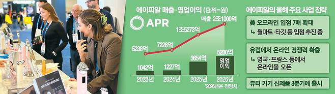 K뷰티의 간판 기업인 에이피알(APR)이 올해 미국 내 유통시설 입점을 7배 이상으로 늘리고 유럽에서는 온라인 사업을 본격 확장해 매출 2조원 시대를 열 것으로 보인다. 이와 함께 뷰티 기기 신제품 출시, 기업 간 거래(B2B) 사업 등을 더해 영업이익을 5200억원 이상으로 올려 국내 뷰티 업계 1위를 목표로 한다.