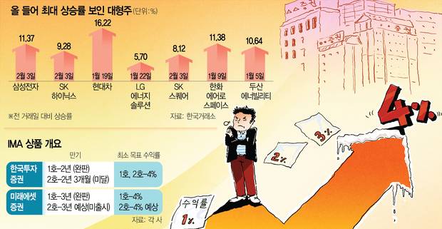8일 금융투자 업계에 따르면 장기 투자 상품이 국내 주식시장 강세장과 맞물려 상대적으로 인기가 시들해졌다는 평가가 나온다. 미래에셋증권은 2호 종합투자계좌(IMA) 출시를 2월에서 3월로 연기하기로 가닥을 잡았다. 한국투자증권도 최근 모집한 2호 IMA가 미달됐다. IMA는 증권사가 망하지 않는 한 원금 보장을 해주면서 예적금보다 높은 금리(최소 4%)를 보장하지만 최근 주가 상승률과 비교하면 투자자의 기대를 충족시키기에는 역부족이다.