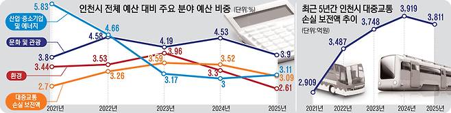 이는 지난해 인천시 전체 예산(일반회계 기준) 중 3.09%를 차지한다. 전체 예산 대비 ‘문화 및 관광’ 분야 예산 비중이 3.90%, ‘산업·중소기업 및 에너지’ 분야는 3.11%인 점을 감안하면 적지않은 규모다. 인천시는 ‘환경’(2.61%), ‘보건’(1.86%) 분야보다도 대중교통 운영 손실을 채우는 데 더 많은 예산을 썼다. 특히 환경 예산은 그동안 대중교통 운영 손실 보전액보다 규모가 컸지만, 2024년부터 역전됐다.