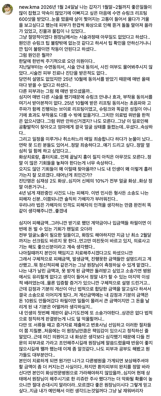 그녀의 설명에 따르면 해당 병원 측은 시술 과정에서의 과실을 부인하며 ‘기기 팁 불량’을 원인으로 꼽고 있는 상황이다. 권민아는 “병원이 동의서 작성 등 기본 절차를 무시했으며, 화상 전문 병원이 아닌 곳에서 계속 치료를 고집하고 있다”고 주장했다.