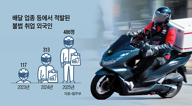사정이 이렇다 보니 배달 자격이 없는 외국인 노동자들이 불법 배달을 하다 적발되는 일도 늘고 있다. 법무부에 따르면 작년 한 해 택배·배달 직종에 불법 취업했다가 적발된 외국인 수는 486명이었다. 집계가 시작된 2023년(117명)보다 4배 이상 늘었다.
