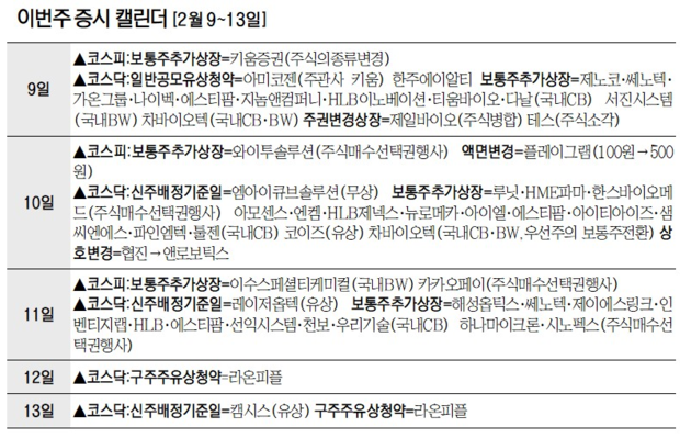 이번주 일반청약을 실시하거나 증시에 상장하는 기업은 없다. 기업공개(IPO) 시장은 지난달과 비슷하게 소강 국면이 지속되는 가운데, 일부 기업만 수요예측 일정을 소화하며 상장을 준비하는 양상이다. 박종선 유진투자증권 연구원은 “2월 IPO 시장은 1월의 소강 상태가 지속되지만, 이후에는 점차 회복될 것으로 예상된다”며 “3월에는 과거(1999∼2025) 같은 달 평균인 6~8개 기업이 상장할 것”이라고 짚었다.