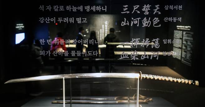 | ▲ 충무공 이순신 장검 칼날에는 '삼척서천 산하동색(三尺誓天 山河動色 석자 칼로 하늘에 맹세하니 산하가 떤다), 일휘소탕 혈염산하(一揮掃蕩 血染山河 한 번 휘둘러 쓸어버리니 피가 산하를 물들인다)'라는 글귀가 새겨져 있다. |