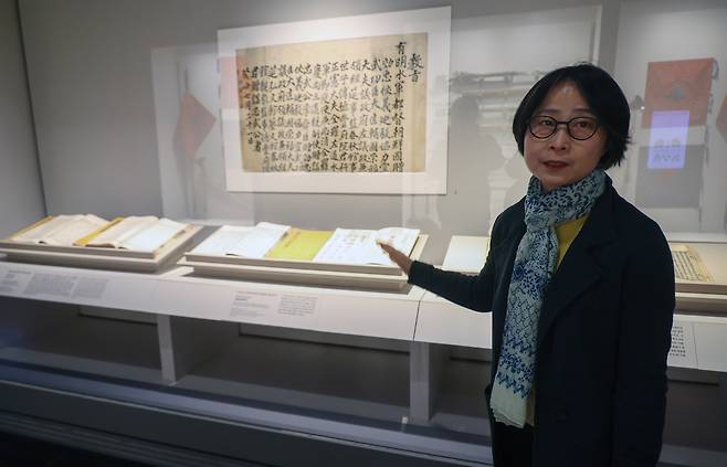 | ▲ 서윤희 국립중앙박물관 학예연구관이 1월 26일 서울 용산구 국립중앙박물관에서 열리고 있는 <우리들의 이순신> 특별전에서 이순신 사후에 영의정 벼슬을 내린 문서인 영의정 증직교지를 소개하고 있다. |
