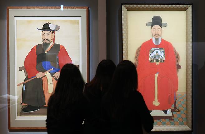 | ▲ 서울 용산구 국립중앙박물관에서 열리고 있는 <우리들의 이순신> 특별전에서 관람객들이 이순신 영정 전시물을 보고 있다. |