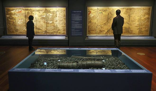 | ▲ 서윤희 국립중앙박물관 학예연구관과 충무공 이순신 연구가인 박종평 서울여해재단 연구소장이 1월 26일 서울 용산구 국립중앙박물관에서 열리고 있는 <우리들의 이순신> 특별전에서 '정왜기공도병' 병풍을 바라보고 있다. 1598년 왜군을 무찌르는 명군의 모습을 담은 채색화 병풍 ‘정왜기공도병’은 스웨덴 발렌베리 가문과 국립중앙박물관이 각각 앞·뒤 부분을 보관해왔는데, 이번 전시에서 처음으로 나란히 공개됐다. |