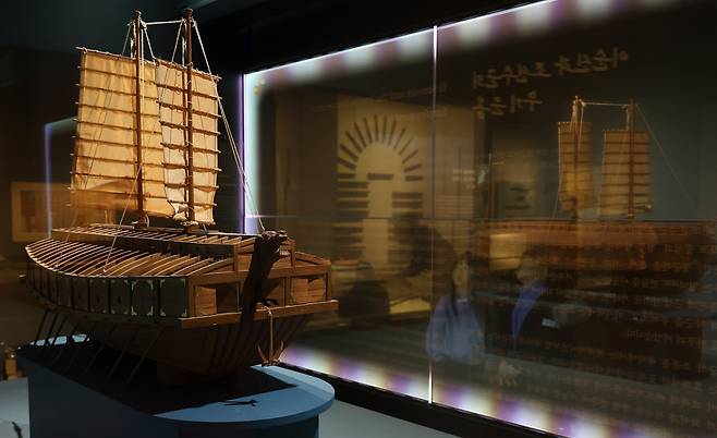| ▲ 1월 26일 서울 용산구 국립중앙박물관에서 열리고 있는 <우리들의 이순신> 특별전에서 학생들이 거북선 모형 영상을 보고 있다. |