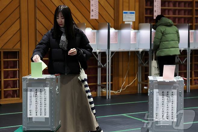 (도쿄 로이터=뉴스1) 김지완 기자 = 일본 중의원 선거가 열리는8일 한 여성이 도쿄의 투표소에서 투표함에 투표 용지를 넣고 있다. 2026.02.08