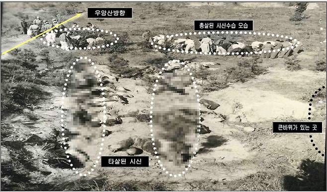 | ▲ 당산 학살 청주형무소에 구금되었던 우익인사들의 학살된 모습. (모자이크는 편집 과정에서 추가) |