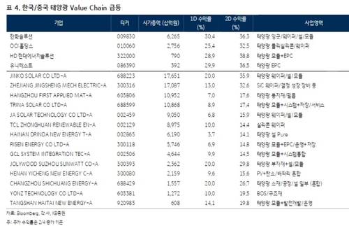 한화솔루션[009830]의 주가는 지난 4일 29.95% 올라 상한가를 기록했으며, 유니테스트[086390]도 같은 날 29% 올랐다. HD현대에너지솔루션[322000]은 29.83%, OCI홀딩스[010060]는 28% 이상 올랐다.
