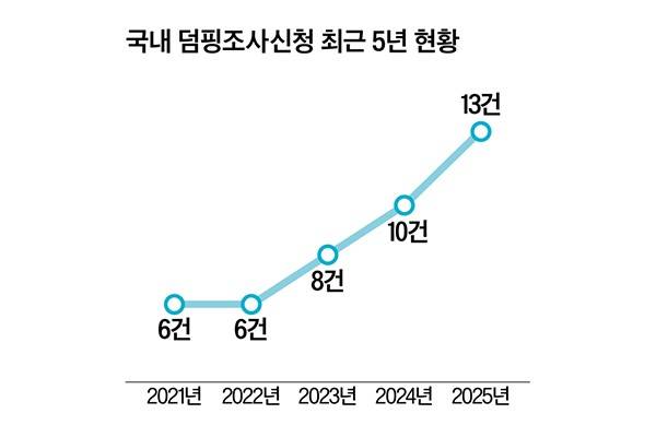 무역위에 따르면, 반덤핑 조사 신청은 2021년과 2022년 각 6건에서 2023년 8건, 2024년 10건, 2025년 13건으로 증가세를 보였다. 덤핑 제품이 한국 시장에서 차지하는 평균 규모는 2021년 1503억 원에서 2025년 1조8000억 원으로 10배 이상 커졌다.