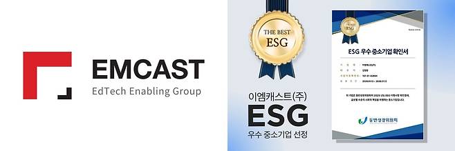에드테크(EdTech) 전문 기업 이엠캐스트㈜(대표 김정웅)가 동반성장위원회의 'ESG 우수 중소기업' 평가에서 전 항목 만점을 기록하며 'ESG 이행률 100% 확인서'를 획득했다고 밝혔다.