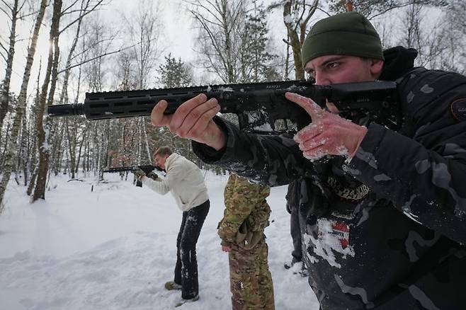 [키이우=AP/뉴시스] 8일(현지 시간) 우크라이나 키이우에서 제3 강습여단이 운영하는 국가 저항을 위한 전술·의료 교육 과정에 참가한 민간인들이 각종 전술과 응급 처치 기술 최종 평가를 받고 있다. 2026.02.09.
