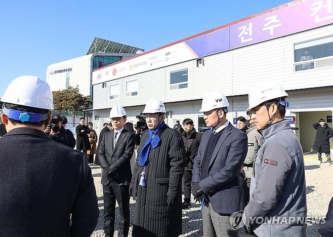 (전주=연합뉴스) 김동철 기자 = 우범기 전북 전주시장(가운데)이 9일 전주시 덕진동 옛 종합경기장 부지에서 2028년까지 건립될 전주컨벤션센터의 현장 설명을 듣고 있다. 전주컨벤션센터는 연면적 8만3천㎡에 지하 1층∼지상 4층 규모로 건립될 예정이다. 컨벤션센터는 1만㎡ 규모의 전시장과 2천명 이상 수용할 수 있는 대회의실, 중소회의실 22실 등을 갖춘다. 2026.2.9