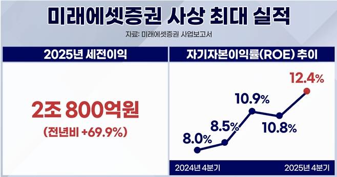 미래에셋증권의 2025년 연결 기준 세전이익은 1년 전보다 70% 늘어난 2조800억원을 기록했습니다. 사상 최대 실적입니다. 자기자본 역시 12조 1천억원에서 13조 5천억원으로 늘었고, 자본 효율성을 보여주는 ROE도 12.4%까지 올라오면서 내실까지 챙겼다는 평가입니다. IB를 제외한 대부분의 사업 부문에서 호실적을 기록했습니다.