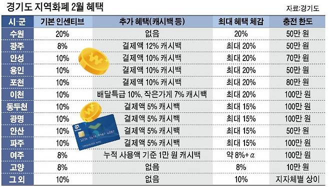 광명시(충천 100만 원)와 안산시(충전 50만 원), 파주시(충전 100만 원)는 10% 인센티브에 사용금액의 5%를 캐시백으로 돌려준다. 여주시(충전 100만 원)는 8% 인센티브에 누적 사용금액에 따라 1만 원을 캐시백 한다.