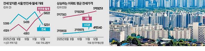 9일 국토교통부 실거래가 공개시스템에 따르면 지난해 12월 서울 아파트 신규 임대차 계약 중 반전세 거래는 4956건으로 집계됐다. 월세와 높은 보증금을 동시에 내는 반전세는 통상 보증금이 월세의 20배가 넘는 임대차 계약이다. 전셋값 급등으로 신규 대출을 받기 어려운 임차인이 주로 높아진 보증금을 월세로 치환해 지불한다.