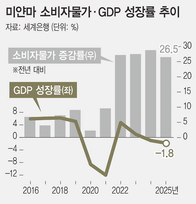 내전은 삶의 비용도 끌어올렸다. 세계은행 통계에 따르면 군부가 집권한 뒤 미얀마의 물가 상승률은 2022년 이후 20% 후반대를 이어가고 있다. 식료품과 의약품, 전기요금 등 생계비 전반이 꾸준히 오르며 가계 부담이 커졌다. 특히 군부의 수입 규제로 유통이 막힌 품목은 암시장에서 거래되며 가격이 크게 뛰었다.